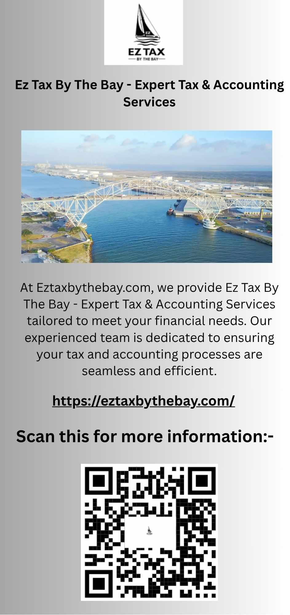 At Eztaxbythebay.com, we provide Ez Tax By The Bay - Expert Tax & Accounting Services tailored to meet your financial needs. Our experienced team is dedicated to ensuring your tax and accounting processes are seamless and efficient.